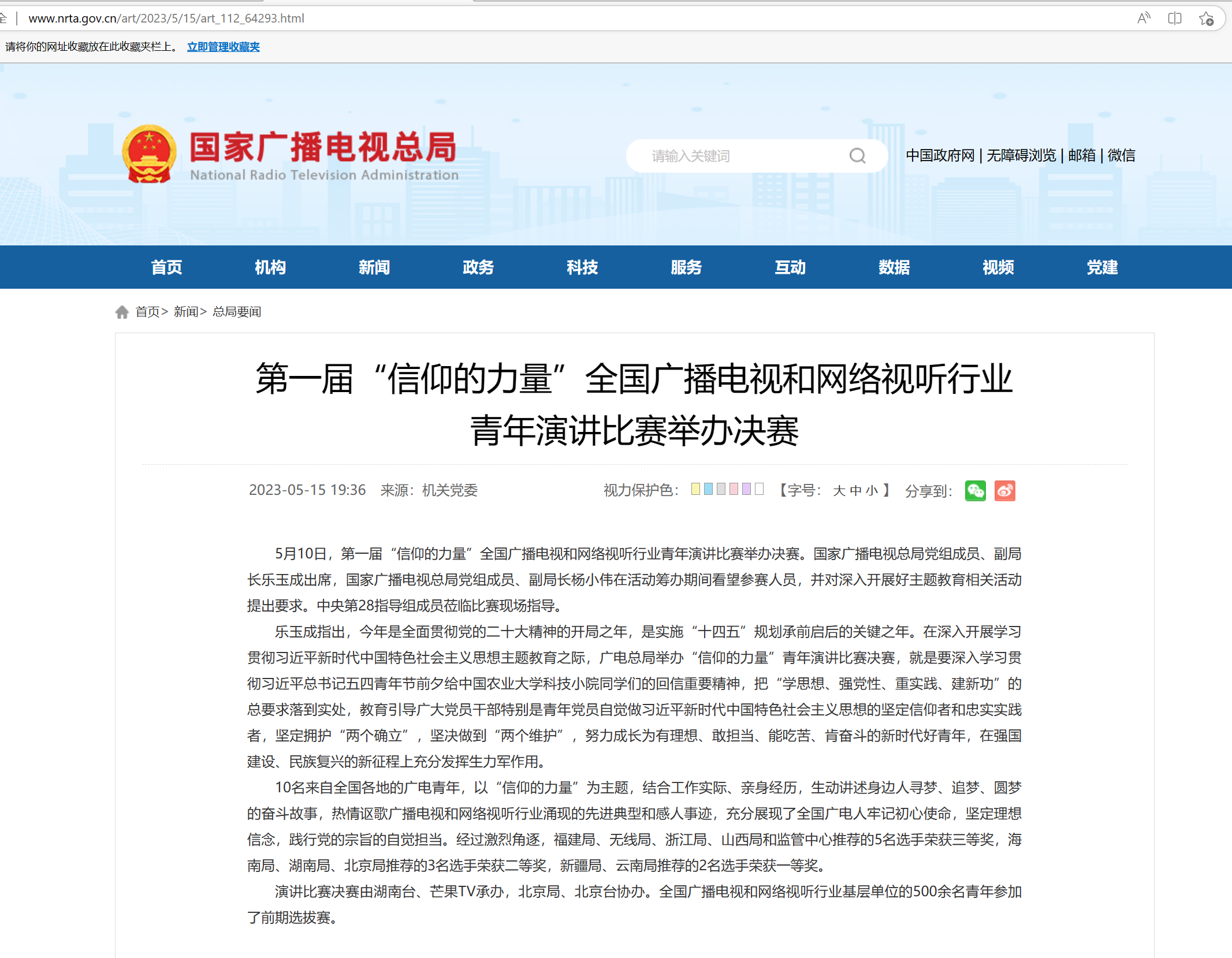 5月10日,第一届“信仰的力量”全国广播电视和网络视听行业青年演讲比赛举办决赛。国家广播电视总局党组成员、副局长乐玉成出席,国家广播电视总局党组成员、副局长杨小伟在活动筹办期间看望参赛人员,并对深入开展好主题教育相关活动提出要求。中央第28指导组成员莅临比赛现场指导。